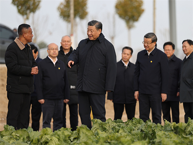 11月10日,中共中央总书记、国家主席、中央军委主席习近平在北京、河北考察灾后恢复重建工作。这是10日下午,习近平在河北保定涿州市刁窝镇万全庄村村边农田察看大白菜长势。新华社记者 鞠鹏 摄