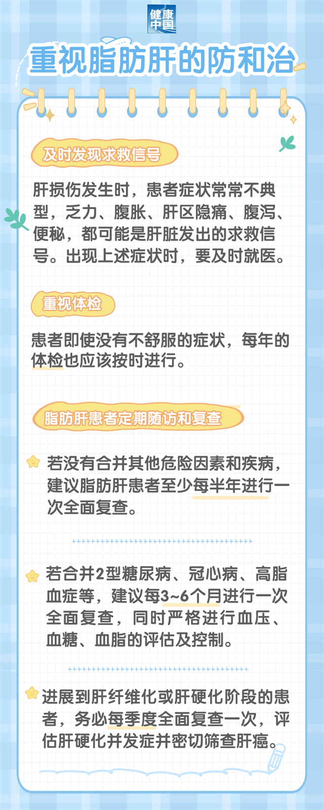 一部分脂肪肝患者还可以跳过肝硬化阶段,直接进展到肝癌。我们团队开展的一项研究中,纳入了273例被诊断为代谢相关肝癌的患者,其中大约50%的患者无肝硬化证据。因此,每一个阶段的脂肪肝都不容小觑。把握脂肪肝的加速点,及时就诊干预至关重要。如果因为自己的不重视,导致可控制、可逆转的脂肪肝发展成肝硬化,甚至肝癌,实在令人惋惜。