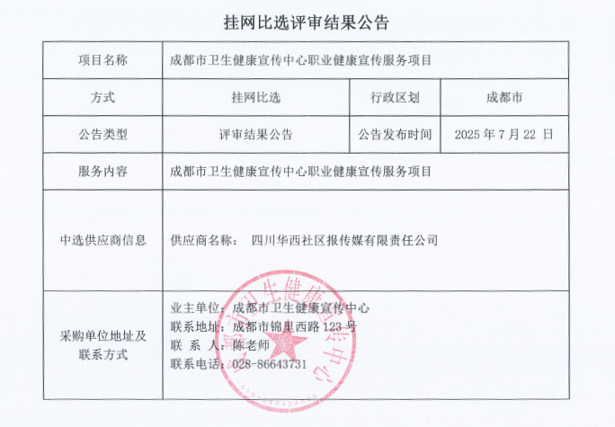 成都市卫生健康宣传中心职业健康宣传服务项目挂网比选评审结果公告