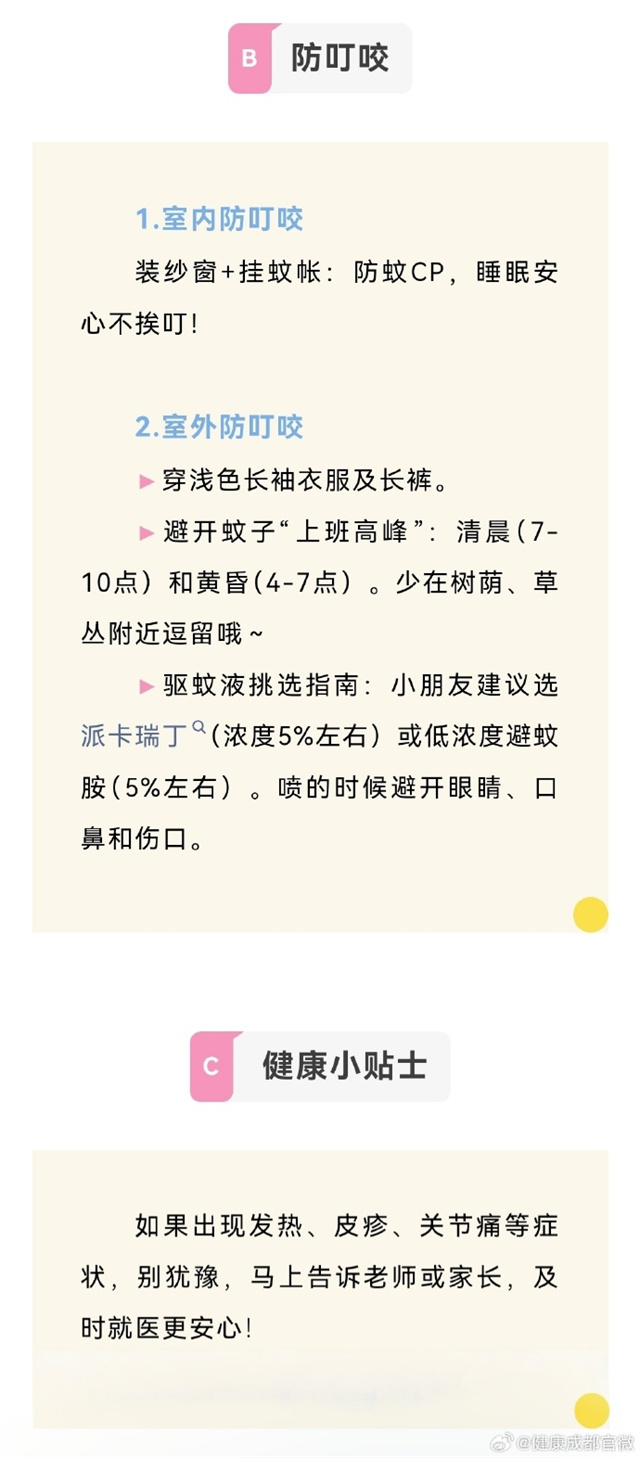 各位同学注意啦~暑假进度条马上拉满,开学即将进入倒计时!@成都市疾病预防控制中心 这份贴心的防蚊指南陪你清爽迎开学,牢记防蚊口诀,安心上课、快乐活动,不怕蚊虫骚扰!