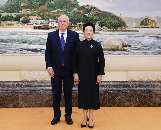 5月2日,国家主席习近平夫人、世界卫生组织结核病和艾滋病防治亲善大使彭丽媛在北京会见法国梅里埃基金会主席阿兰·梅里埃。