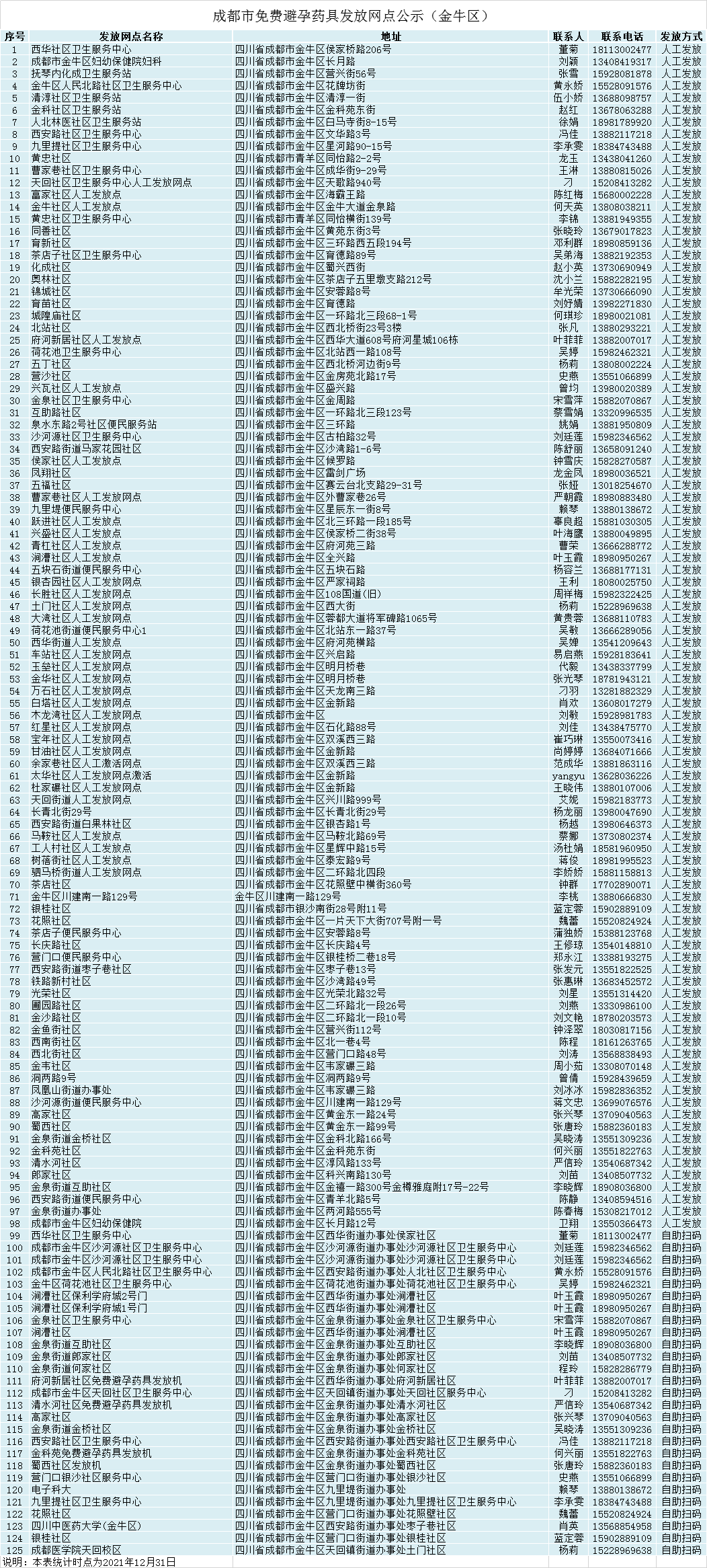 成都市免费避孕药具发放网点公示(金牛区)